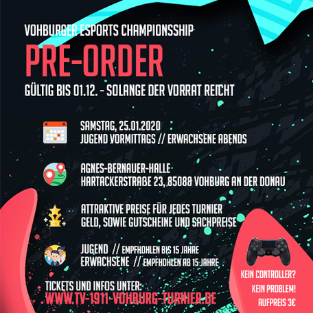 NEWS Vohburger eSports Championship Aktuelles 25. Januar 2020 An die Controller, fertig, los! Wer von Euch holt sich das Preisgeld von insgesamt 500,- Euro ab? Spannung, Nervenkitzel, Schnelligkeit! Mit ausreichend Geschick und Fingerspitzengefühl liegst du ganz weit vorn bei unserem eSports Turnier! FacebookWhatsAppEmail Ähnliche Artikel Aktuelles F 2-Jugend auch in Geisenfeld erfolgreich Dritter Turniersieg der F2-Junioren beim dritten Turnier im Jahr 2018. Ungefährdet konnte bereits die Gruppenphase mit 3 Siegen und 8:0 Toren gewonnen... Aktuelles F2 auch im letzten Spiel der Hinrunde mit einem Sieg Mit einem 5:3 (2:1) gegen den SV Zuchering 2 beendet die F2 auch das letzte Spiel der Hinrunde mit einem verdienten... Aktuelles TVVShop wieder online TVVShop - Promo Jetzt vorbeischauen und neue Artikel entdecken. http://shop.tv-vohburg.de Aktuelles Einladung zur Jahreshauptversammlung Einladung zur Jahreshauptversammlung des TV Vohburg, am Sonntag 09. Oktober 2022 um 15.00 Uhr im TV Vereinsheim an der Jahnstraße. Einladung.pdf Fussball Die Arbeiten für das Vohburger Stickeralbum sind im vollen Gange Die Arbeiten für das Stickeralbum sind im vollen Gange. Mittwoch, 09.11. – von 16:00 – 19:00 Uhr Samstag, 12.11. – von 10:00 –...