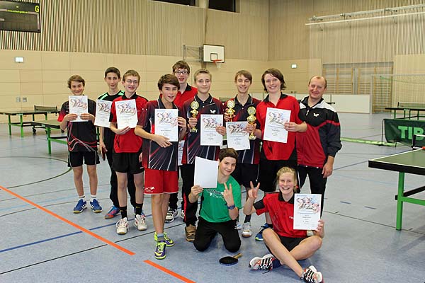 Bei den Schülern war es nur eine Gruppe und so war die Vor- auch gleich die Hauptrunde. Da hatte Simon Spörl, der dieses Jahr neu dazugekommen ist, die Nase vorn. Er machte ein tadellos gutes Spiel und konnte ungeschlagen mit 15:0 Sätzen den Titel entgegen nehmen. Auf Platz 2 mit 12:5 Sätzen kam Luis Töllich und Platz 3 ging an Mika Waatsack mit 8:6 Sätzen.