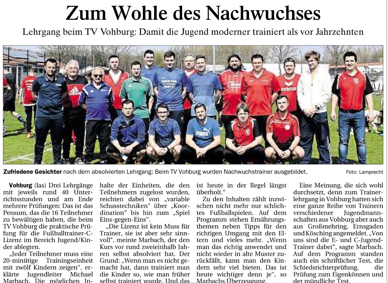 Vohburg (las) Drei Lehrgänge mit jeweils rund 40 Unterrichtsstunden und am Ende mehrere Prüfungen: Das ist das Pensum, das die 16 Teilnehmer zu bewältigen haben, die beim TV Vohburg die praktische Prüfung für die Fußballtrainer-C-Lizenz im Bereich Jugend/Kinder ablegten.